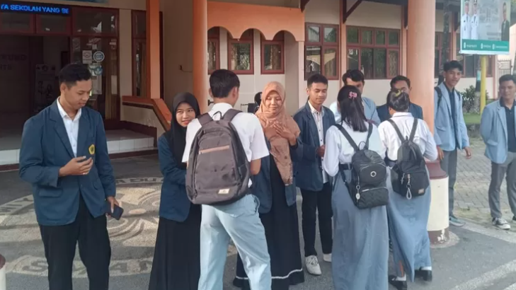 Mereka berdiri di area depan sekolah bersama para guru, tepat di dalam lingkungan sekolah untuk menyapa dan menyambut para siswa setiap pagi dengan senyuman dan sapaan hangat.